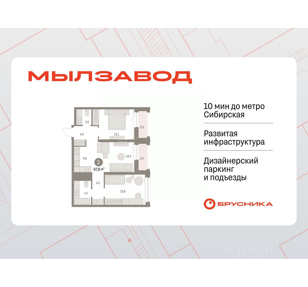 Квартира с кухней-гостиной и двумя спальнями в квартале ''Мылзавод''. Особенности планировки: второй санузел, вид во двор, лоджия, предчистовая отделка. квартиры в нашей базе: МЛ-ГП4.1-8-8.22.9.