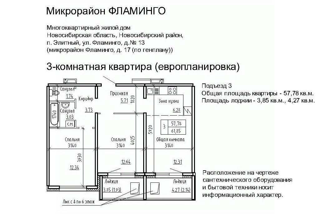 Продаётся 3-комнатная квартира в сданном доме (Фламинго, 17 (поз. 12)), срок сдачи: III-кв. 2018, общей площадью 65.3 кв.м., на 5 этаже. Расположение, транспортная доступность Жилой комплекс ''Фламинго'' расположен в поселкеЭлитный Новосибирского района, на бывших сельскохозяйственных угодьях площадью 45 га, примыкающих к Кировскому району Новосибирска. Микрорайон считается экологически благоприятным пригородом, окруженным кварталами частных домов: по соседству находятся дачныекомплексы и коттеджные поселки ''Березки'' и ''Элитный''. С северной и южной стороны участок застройки граничит с лесополосами. шаговой доступности находится несколько остановок общественного транспорта: около двадцати линий автобусов, маршрутных такси и троллейбусов. Транспортные преимущества для владельцев автомобилей обеспечивает быстрый выезд на Ордынское и Советское шоссе (с новыми развязками), Бугринский мост и Чуйский тракт. Путь на машине до международного аэропорта Толмачево, главного железнодорожного вокзала или центра Новосибирска займет около сорока минут, до автовокзала - полчаса, до площади Карла Маркса (центр левобережья) - двадцать минут. Инфраструктура В микрорайоне Фламинго запланировано строительство спортивного комплекса ''Магис-Фламинго'' с бассейном и лыжно-тренировочной базой. В детском саду предусмотрено 330 мест, в общеобразовательной школе - 1100 мест. В поселке есть поликлиника на 300 посещений в смену, Дом культуры (более 40 кружков и секций), две общеобразовательные школы, колледж, несколько детских садов, библиотека. В шаговой доступности расположена ледовая арена, стадион, городок аттракционов, кинотеатр, сквер, несколько продуктовых магазинов, кафе, аптек, торговый комплекс и рынок. На общественном транспорте можно доехать до гипермаркета ''Метро'', площади Маркса с крупными торговыми комплексами и многочисленными объектами инфраструктуры, а также до центральных районов Новосибирска. Надежность застройщика Масштабный проект реализует алтайская компания ''Жилищная инициатива'', основанная в 1998 году в Барнауле. Комплексное освоение земель - приоритетное направление в девелоперских проектах компании. В активе застройщика жилые комплексы в Барнауле: ''Рубин'', ''Дружный'', ''Дмитровские горки'', ''Лазурный''. В 2008 году ''Жилищная инициатива'' вышла на рынок Новосибирска, открыв дочернее подразделение - ООО ''Новосибирский квартал''. Глава обоих предприятий - Ю.А. Гатилов, почетный строитель России. За 20 лет было введено в эксплуатацию более 100 домов, штат компании составляет около 700 человек. Архитектура Жилой комплекс ''Фламинго'' - это 40 пятиэтажных кирпичных и панельных домов и два гаражных комплекса на территории 44,8 га. Всего в комплексе будет представлено 3995 однокомнатных, двухкомнатных и трехкомнатных квартир площадью от 33 до 110 кв. м, расположенных на всех пяти этажах здания. Все квартиры в ЖК ''Фламинго'' передаются покупателям с готовым ремонтом под ключ. Фасады выполнены в светло-серых, бежевых и коричневых оттенках. Наружные стены панельн