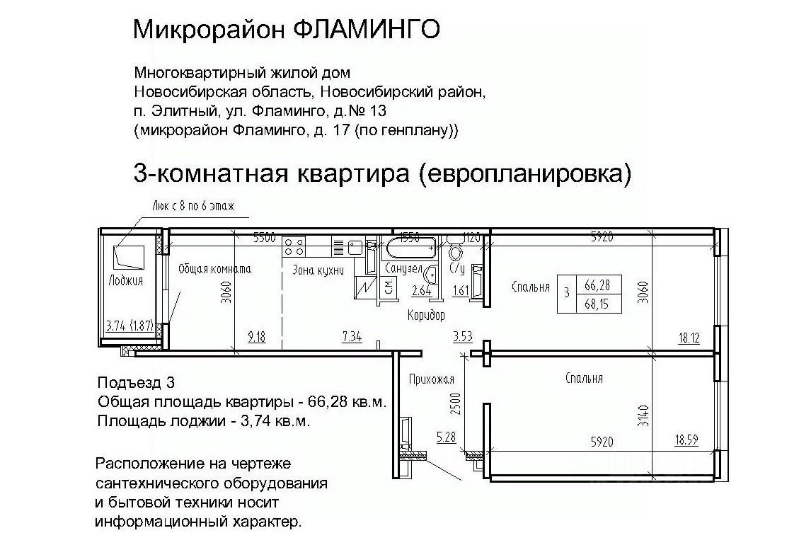 Продаётся 3-комнатная квартира в сданном доме (Фламинго, 17 (поз. 12)), срок сдачи: III-кв. 2018, общей площадью 69.4 кв.м., на 5 этаже. Расположение, транспортная доступность Жилой комплекс ''Фламинго'' расположен в поселкеЭлитный Новосибирского района, на бывших сельскохозяйственных угодьях площадью 45 га, примыкающих к Кировскому району Новосибирска. Микрорайон считается экологически благоприятным пригородом, окруженным кварталами частных домов: по соседству находятся дачныекомплексы и коттеджные поселки ''Березки'' и ''Элитный''. С северной и южной стороны участок застройки граничит с лесополосами. шаговой доступности находится несколько остановок общественного транспорта: около двадцати линий автобусов, маршрутных такси и троллейбусов. Транспортные преимущества для владельцев автомобилей обеспечивает быстрый выезд на Ордынское и Советское шоссе (с новыми развязками), Бугринский мост и Чуйский тракт. Путь на машине до международного аэропорта Толмачево, главного железнодорожного вокзала или центра Новосибирска займет около сорока минут, до автовокзала - полчаса, до площади Карла Маркса (центр левобережья) - двадцать минут. Инфраструктура В микрорайоне Фламинго запланировано строительство спортивного комплекса ''Магис-Фламинго'' с бассейном и лыжно-тренировочной базой. В детском саду предусмотрено 330 мест, в общеобразовательной школе - 1100 мест. В поселке есть поликлиника на 300 посещений в смену, Дом культуры (более 40 кружков и секций), две общеобразовательные школы, колледж, несколько детских садов, библиотека. В шаговой доступности расположена ледовая арена, стадион, городок аттракционов, кинотеатр, сквер, несколько продуктовых магазинов, кафе, аптек, торговый комплекс и рынок. На общественном транспорте можно доехать до гипермаркета ''Метро'', площади Маркса с крупными торговыми комплексами и многочисленными объектами инфраструктуры, а также до центральных районов Новосибирска. Надежность застройщика Масштабный проект реализует алтайская компания ''Жилищная инициатива'', основанная в 1998 году в Барнауле. Комплексное освоение земель - приоритетное направление в девелоперских проектах компании. В активе застройщика жилые комплексы в Барнауле: ''Рубин'', ''Дружный'', ''Дмитровские горки'', ''Лазурный''. В 2008 году ''Жилищная инициатива'' вышла на рынок Новосибирска, открыв дочернее подразделение - ООО ''Новосибирский квартал''. Глава обоих предприятий - Ю.А. Гатилов, почетный строитель России. За 20 лет было введено в эксплуатацию более 100 домов, штат компании составляет около 700 человек. Архитектура Жилой комплекс ''Фламинго'' - это 40 пятиэтажных кирпичных и панельных домов и два гаражных комплекса на территории 44,8 га. Всего в комплексе будет представлено 3995 однокомнатных, двухкомнатных и трехкомнатных квартир площадью от 33 до 110 кв. м, расположенных на всех пяти этажах здания. Все квартиры в ЖК ''Фламинго'' передаются покупателям с готовым ремонтом под ключ. Фасады выполнены в светло-серых, бежевых и коричневых оттенках. Наружные стены панельн