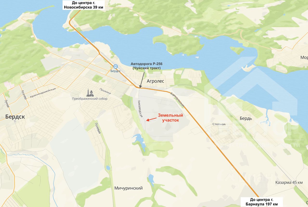3) Другая информация: - от автомобильной дороги Р-256 Чуйский тракт до участка проходит хорошая асфальтированная дорога ул. Химзаводская, - земельный участок расположен на первой линии место на виду, вдоль ул. Химзаводская, - остановка общественного транспорта Химзавод находится в 100 м от земельного участка, из Бердска до ост. Химзавод ходят: автобус 5, маршрутки 12 и 15.