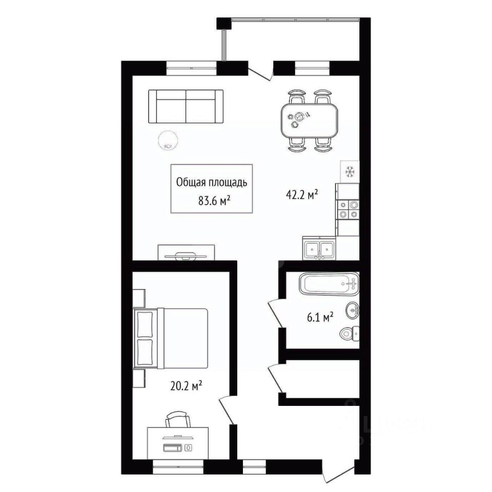 Планировка продумана для практичного использования пространства: кухня-гостиная объединена, что создает ощущение простора, а изолированная спальня гарантирует приватность.