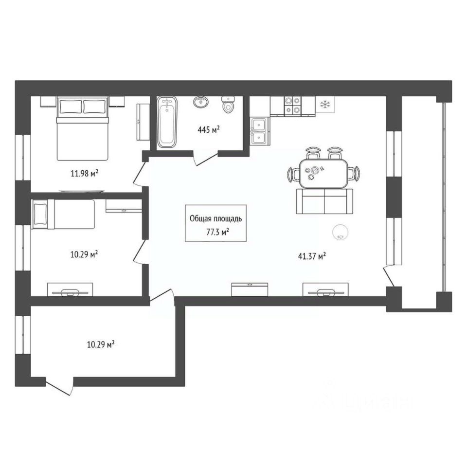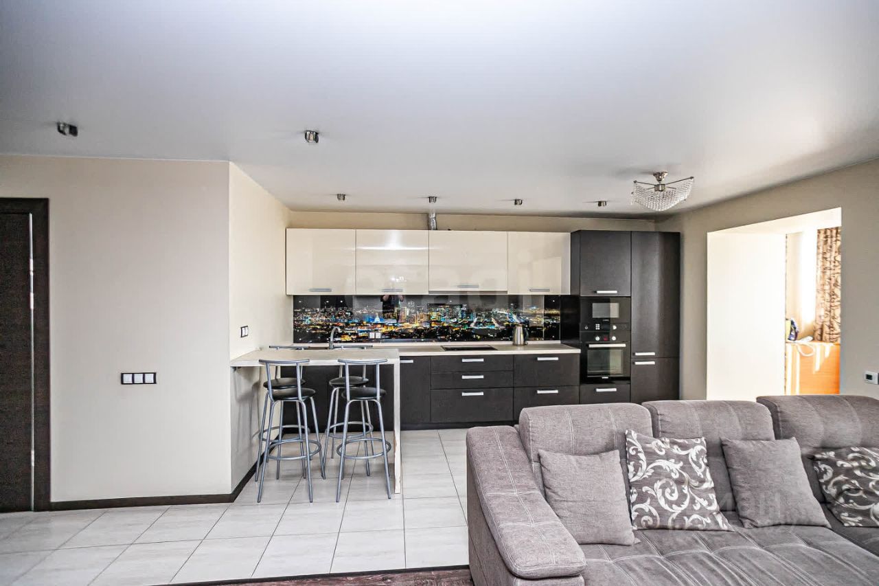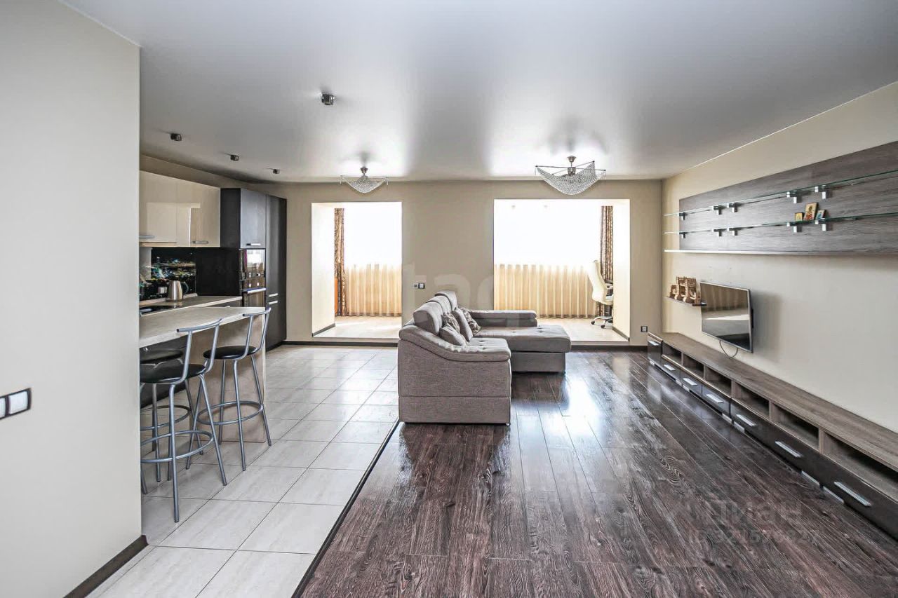 Планировка включает две изолированные спальни и большую кухню-гостиную, объединенную с утепленной лоджией, где оборудована рабочая зона.
