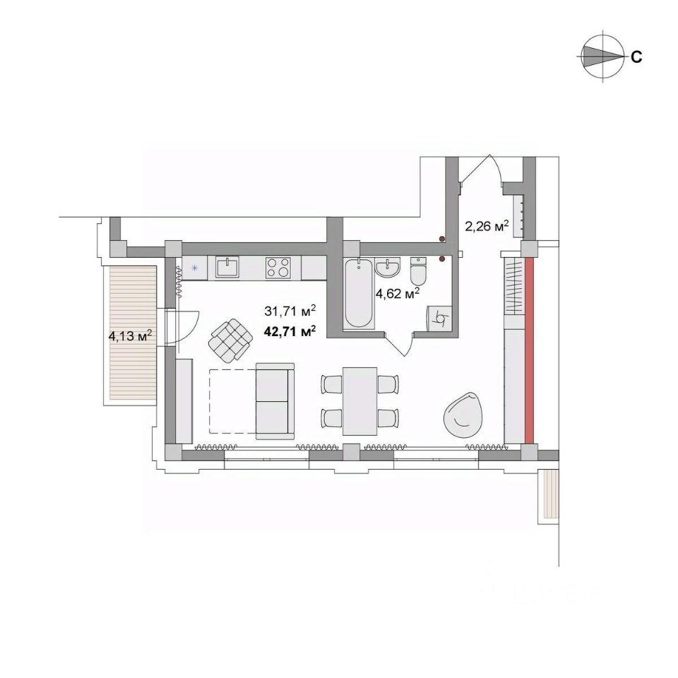 Общая площадь42,71 м2