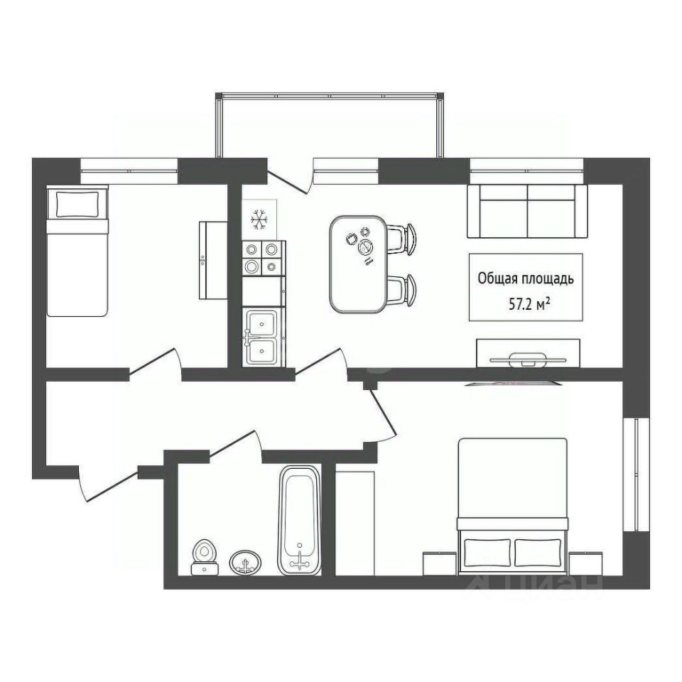 Трехкомнатная квартира-студия площадью 57,2 кв. м (+ балкон-терраса 3,5кв.м) расположена в жилом комплексе Европейский берег.
