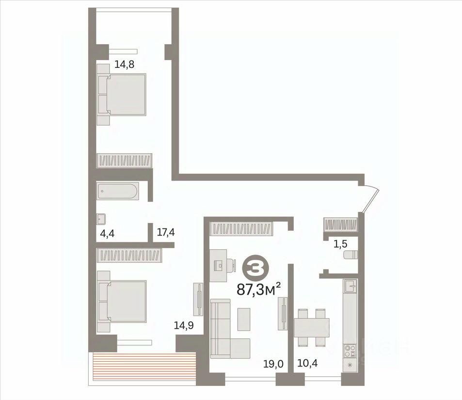 Продаётся светлая 3-комнатная квартира площадью 87.3 кв.мс удобной планировкой: три изолированные комнаты, большая кухня, раздельный санузел и застеклённая лоджия.