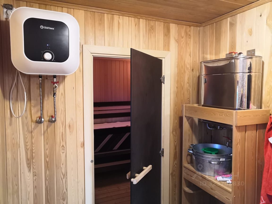 ДОПОЛНИТЕЛЬНО: Печь Termofor, бак на 80 литров, труба - сэндвич. Водонагреватель Thermex, 30 л. В дом заведена сезонная вода. На 2 эт. установлен доп. пласт. бак на 200 л. В помывочной теплый пол, душ.