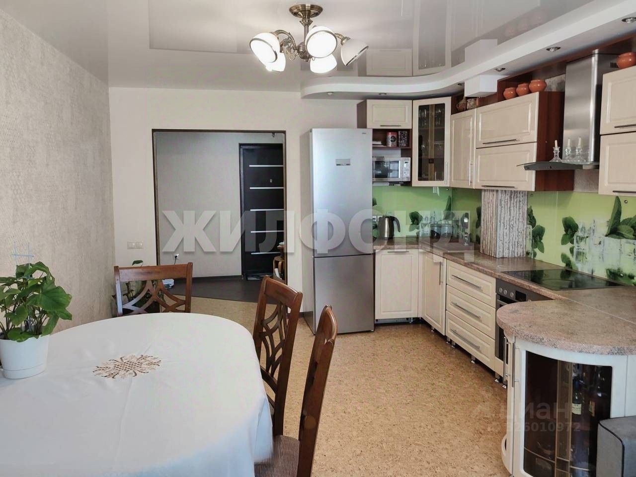 В квартире две просторные спальни и большая кухня - гостиная 19 кв.м. Качественный, классический ремонт прослужит не один год. По всей квартире в качестве напольного покрытия применено пробковое покрытие, в зоне входа и в санузле - керамогранит. Установлены теплые пластиковые окна, натяжные потолки, современные радиаторы отопления, санузел отделан коллекционным кафелем, толстая входная дверь и шпонированные межкомнатные двери. Сантехника в отличном состоянии, установлена инсталляция, подвесная тумба с раковиной, водонагреватель. Отдельно выделена постирочная зона. В одной из спален красивое эркерное окно и выход на витражную лоджию, застекленную и красиво отделанную. Квартира предлагается со всей встроеной мебелью - кухонный гарнитур с техникой, встроенные шкафы в коридоре, гардеробная, шкаф в детской, в санузле мебель и водонагреватель.